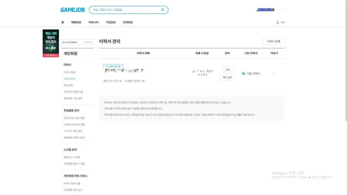 게임잡에서는 마이페이지에서 이력서를 등록 및 관리할 수 있습니다.