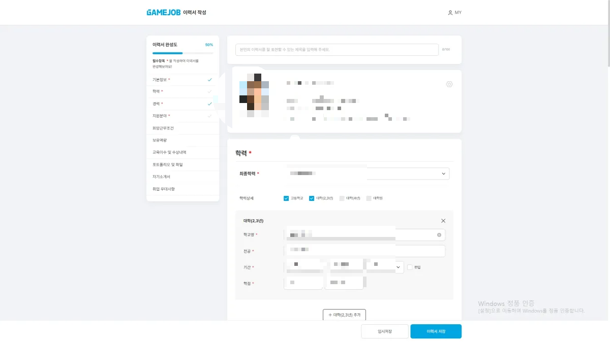 게임잡에서는 마이페이지에서 이력서를 등록 및 관리할 수 있습니다.